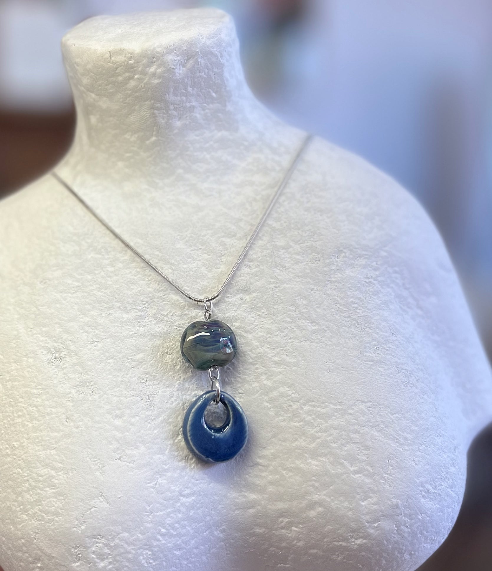 This unique pendant features a rich blue design paired with a delicate glass bead. It is suspended from a 16-inch hypoallergenic chain, ensuring both style and comfort.