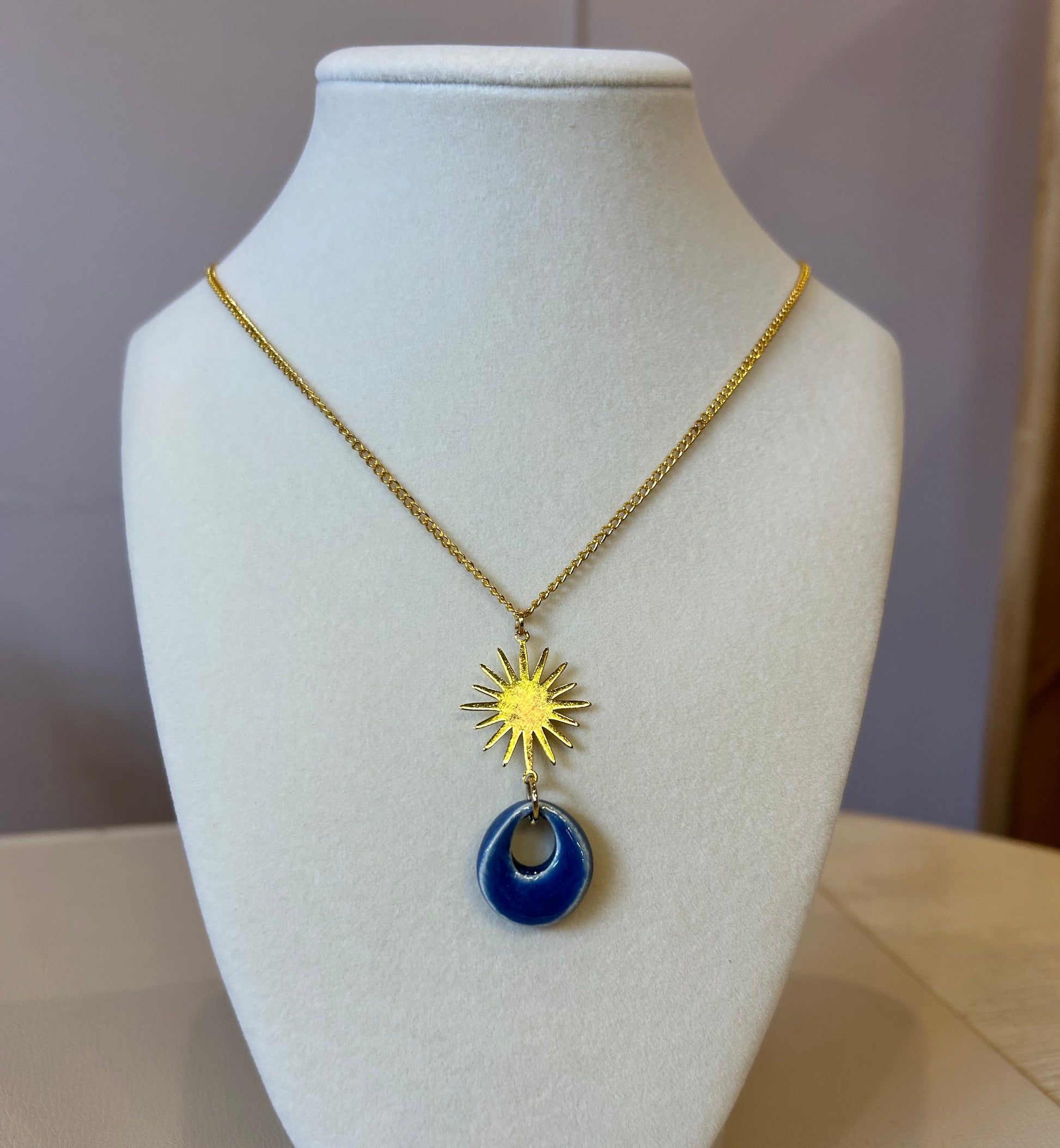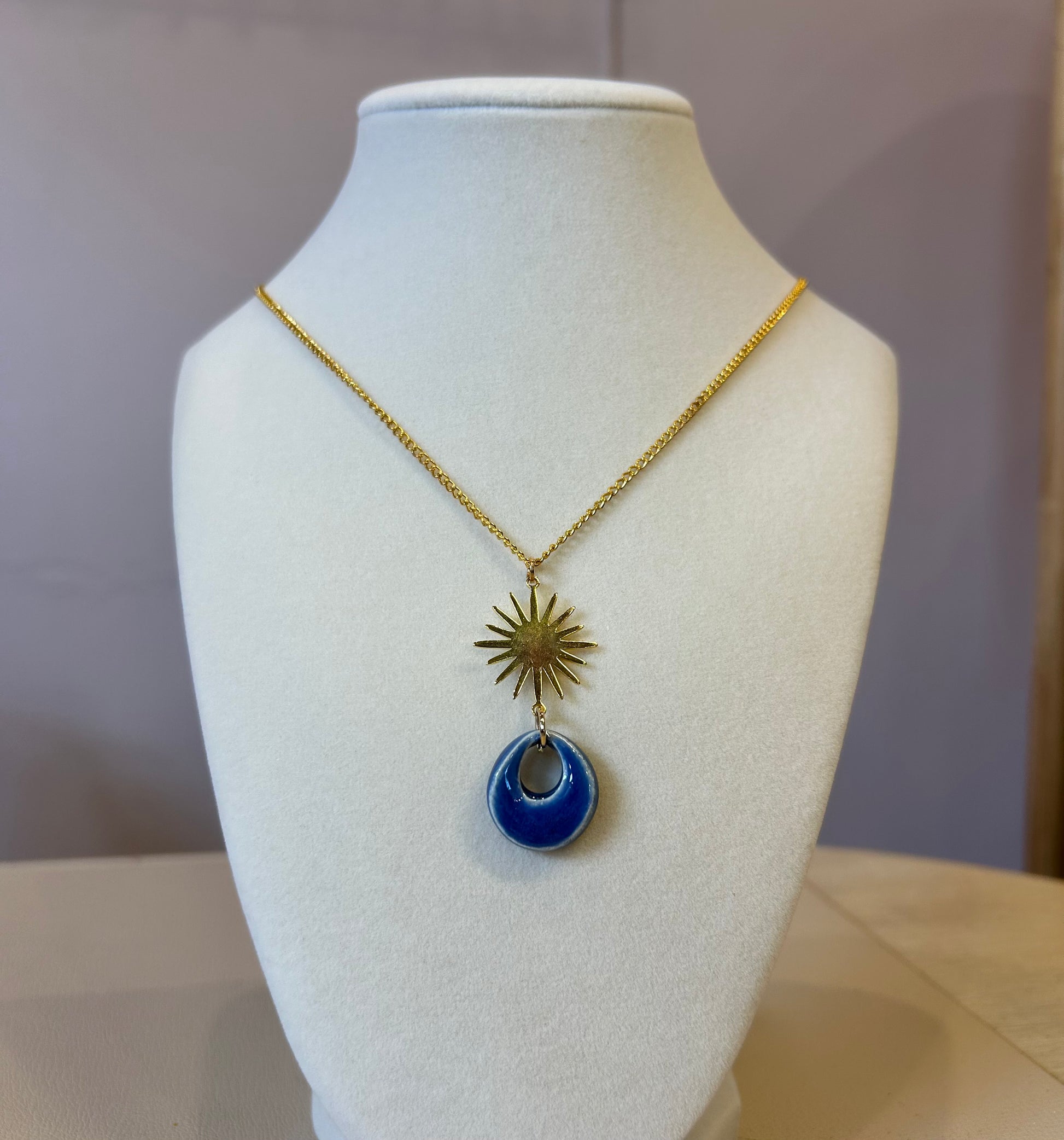 Eye-catching and stunning, this piece dramatically shines in the sun and sets a mystical tone to every outfit. The deep blue ceramic piece hangs from a shining star.