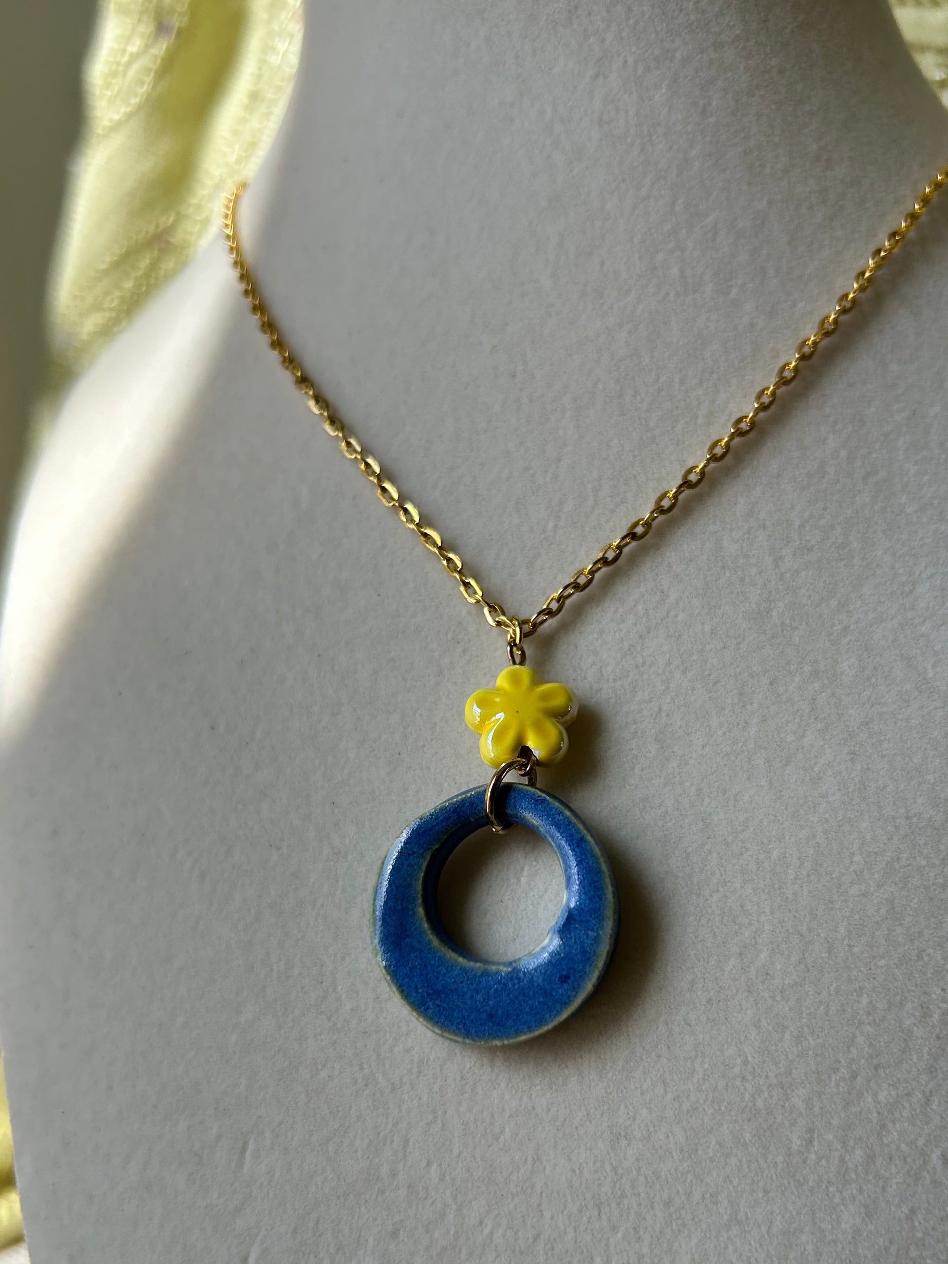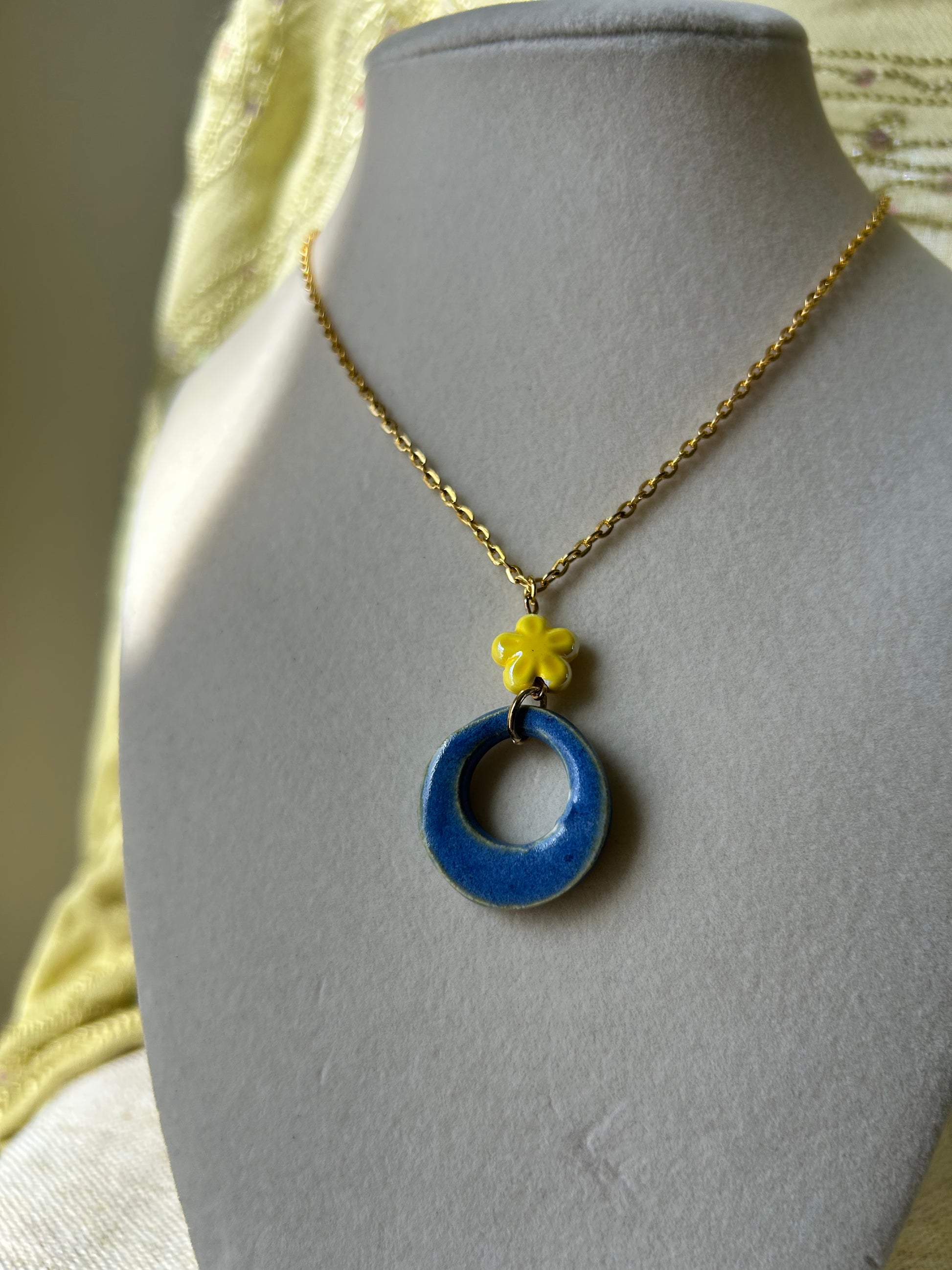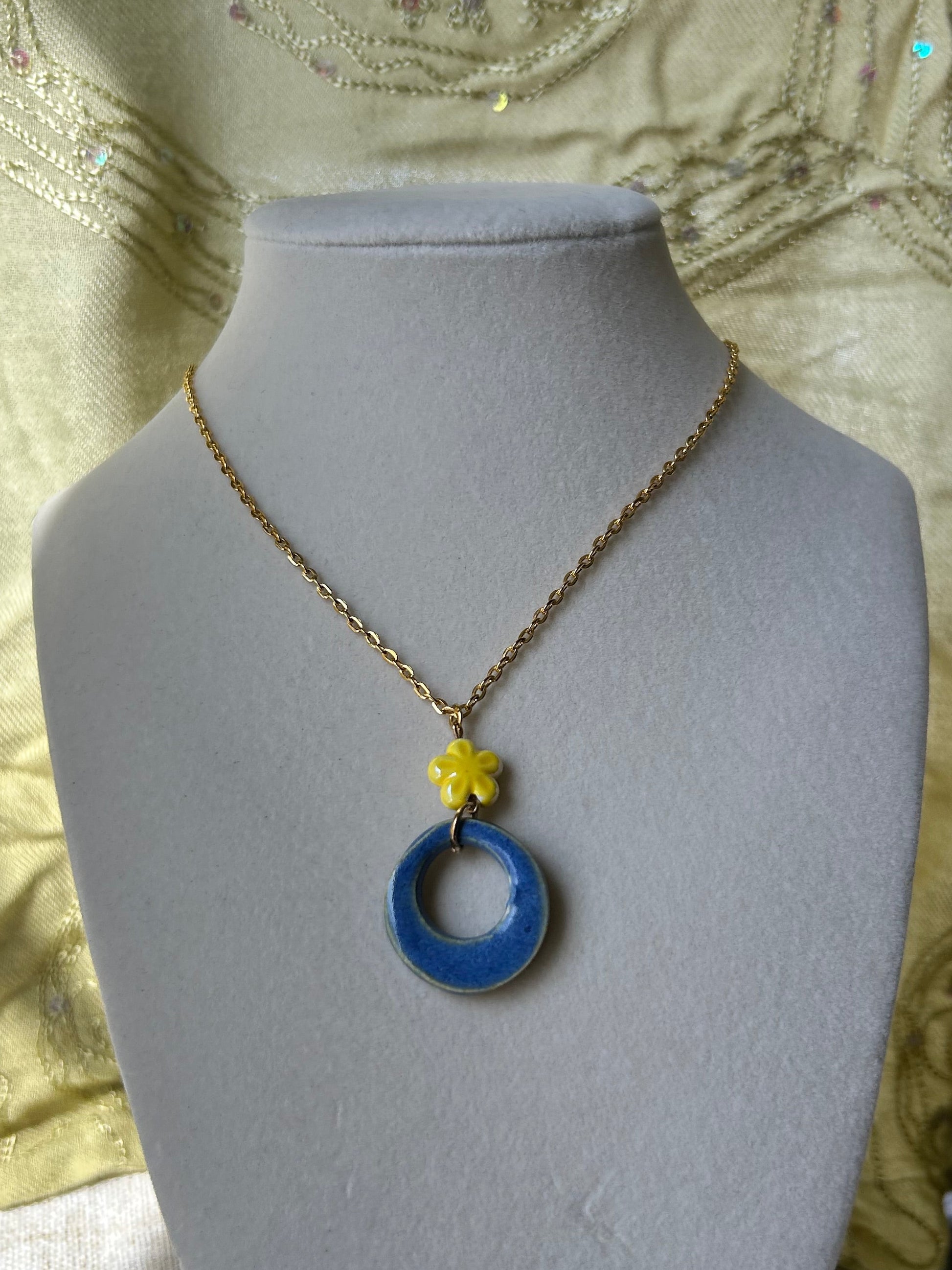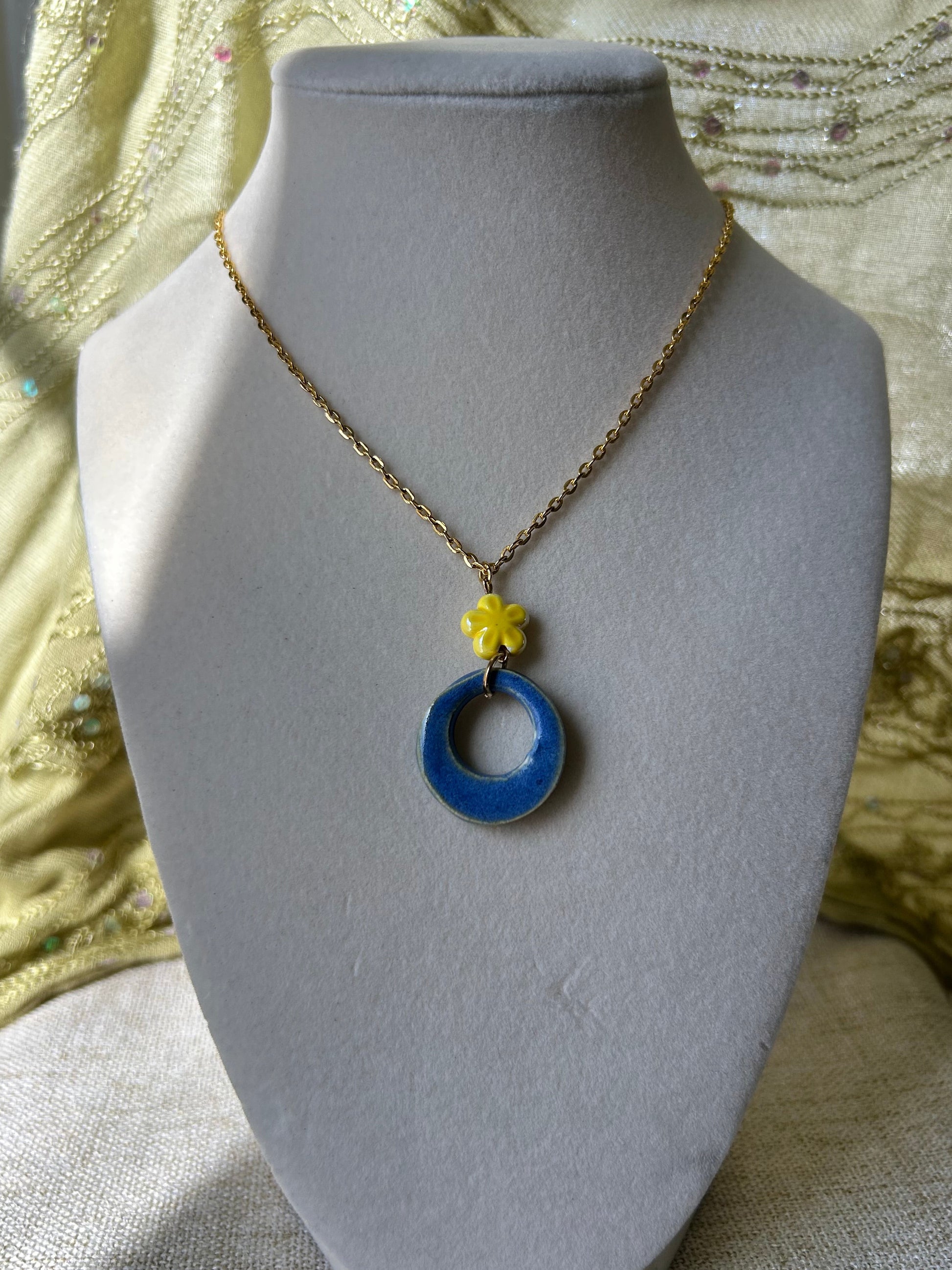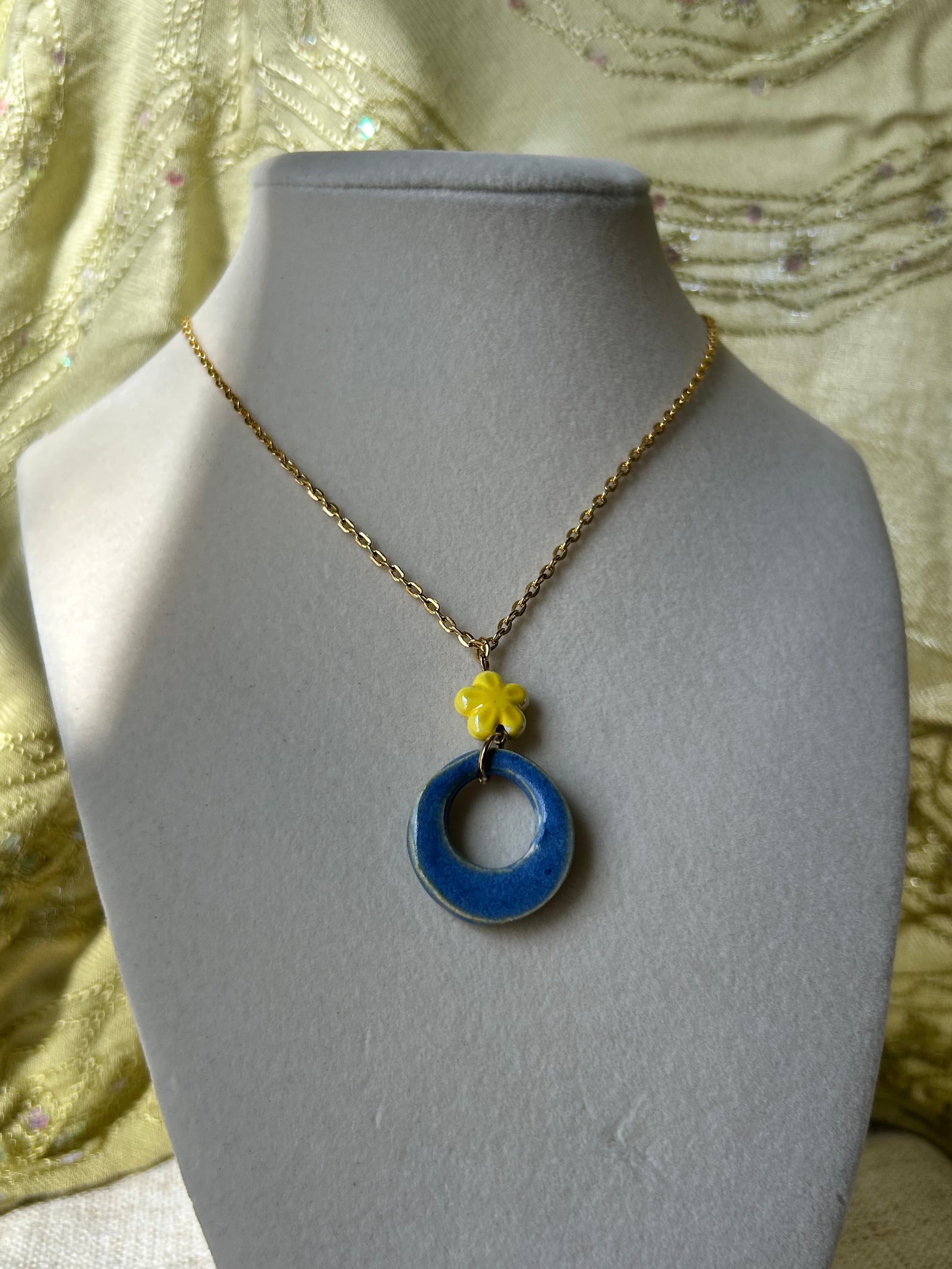 This beautiful blue piece has a yellow lining and complimented by a yellow flower.