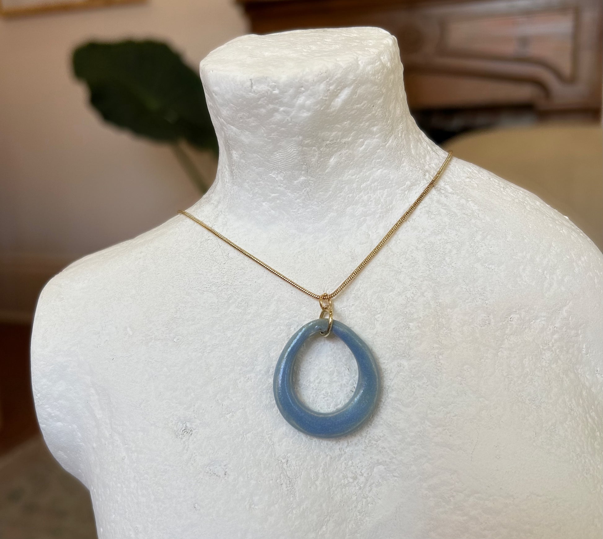 This pendant features a matte light blue finish accented with yellow highlights, creating a refined and striking shine.
